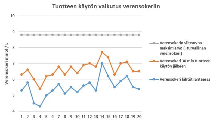 Alla olevassa kuvassa on havainnollistettu tuotteen käytön vaikutusta verensokeriin. Oranssi käyrä kuvassa kuvaa verensokeria 30 minuuttia tuotteen käytön jälkeen, jolloin verensokeri on korkeimmillaan ja harmaa käyrä havainnollistaa verensokerin viitearvon maksimiarvoa. Tulokset osoittavat, että verensokeri on vielä kaukana verensokerin viitearvon ylärajasta (= varmuudella turvallinen verensokeri).